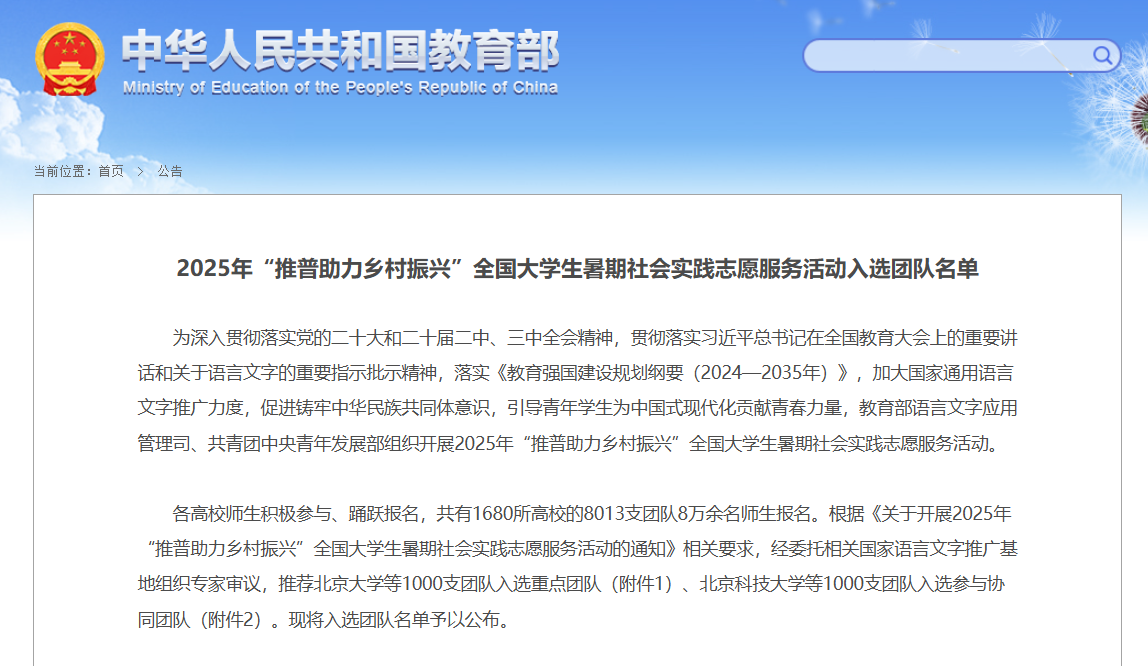 7月3日,教育部公布2025年“推普助力乡村振兴”全国大学生暑期社会实践志愿服务活动入选团队名单,beat365在线唯一官网“铁韵新声”大学生推普志愿服务队成功入选重点团队。